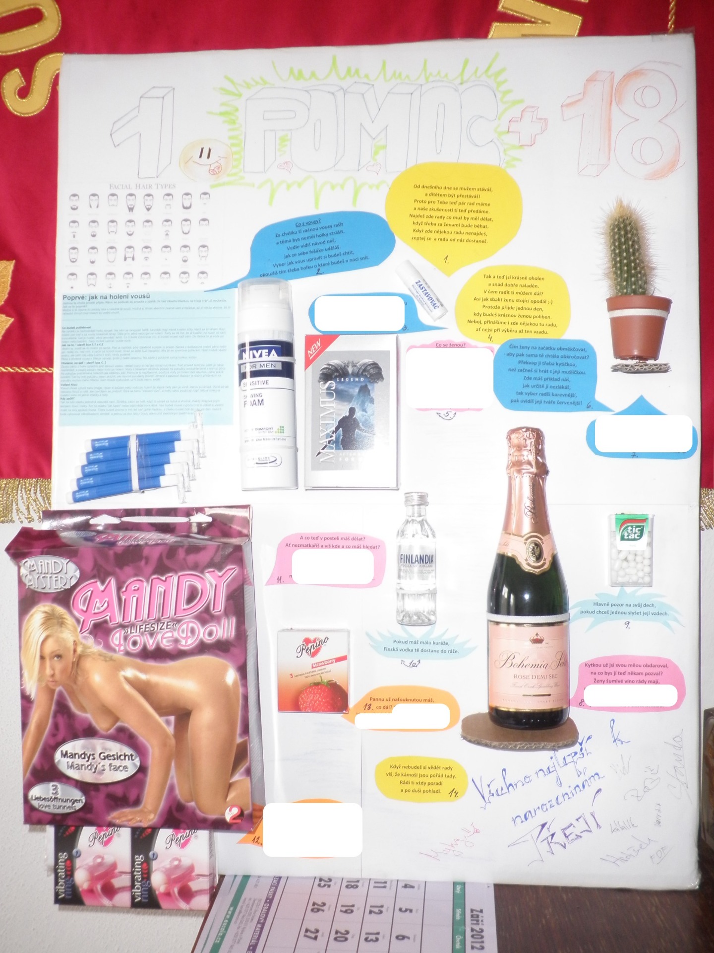 Tento dárek nebo spíše tabule s dárky a vtipnými popisky ve verších dovedla kamaráda až k slzám dojetí. Překvapte podobně vy své kamarády. Rád pomohu s podobnou tabulí i pro jinou příležitost apod. Text jsem musel vymazat, aby nešlo celý dárek tak jednoduše zkopírovat.